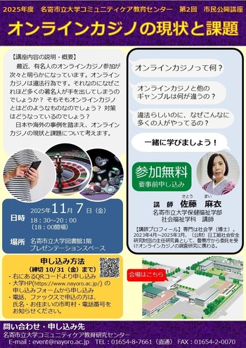 本学社会福祉学科佐藤麻衣先生が講師となり、オンラインカジノの現状と課題をテーマにお話しいただきます。