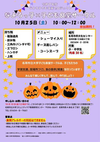 企画・運営は名寄市立大学こども食堂サークル(サークル長・社会福祉学科3年貝塚みづほさん)が行います。