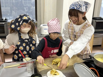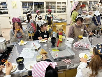 後半は調理室へ移動し、学生と児童が一緒にシューマイ入りチーズ蒸しパンやコーンスープを作り、美味しくいただきました。食事中には栄養についての話や普段の学校での話など、色々おしゃべりをしながら楽しい時間を過ごしました。