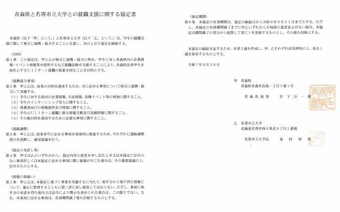 名寄市立大学は、令和7年9月30日、青森県出⾝学⽣の地元への就職情報の提供のため連携を強化することとし、青森県と就職促進に関する協定を締結いたしました。