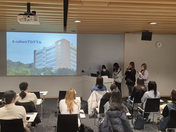 韓国語研修とK-Cultureでは、それぞれのプログラムでの韓国語の授業や韓国文化体験のほか、現地大学生との交流などについて発表がありました。