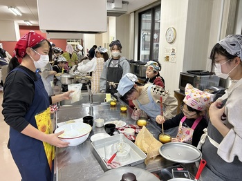 後半は調理室へ移動し、学生と児童が一緒にシューマイ入りチーズ蒸しパンやコーンスープを作り、美味しくいただきました。食事中には栄養についての話や普段の学校での話など、色々おしゃべりをしながら楽しい時間を過ごしました。